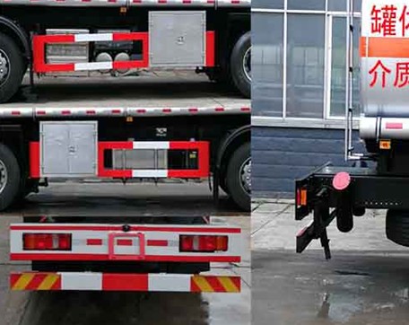 該車為危險品車輛,危險貨物運輸車輛的類型為FL型,類項號:3;罐體有效容積:24.3立方米,介質:原油,乙醇,密度(千克/立方米)分別為:800,800;罐體尺寸(長×長軸×短軸)(mm)為:8800×2400×1660,8800×2250×1560;側、后防護均采用Q235材質螺栓連接在大梁上,后防護裝置斷面尺寸為(mm):140×50,后部防護離地高度:430mm;ABS系統(tǒng)型號為4460046300,生產企業(yè)為威伯科汽車控制系統(tǒng)(中國)有限公司;ABS系統(tǒng)控制器生產企業(yè)/型號為威伯科(上海)管理有限公司/4460046300;選裝EBS,EBS系統(tǒng)控制器生產企業(yè)/型號為威伯科(上海)管理有限公司/EBS3;隨底盤選裝駕駛室;安裝限速裝置,限速80km/h,排氣管前置,前輪盤式制動器;安裝具有衛(wèi)星定位功能的行駛記錄儀,轉向輪裝備輪胎爆胎應急防護裝置;發(fā)動機型號及油耗值(L/100km)為:MC07.31-60(38.2),MC07.34-60(38.2).
