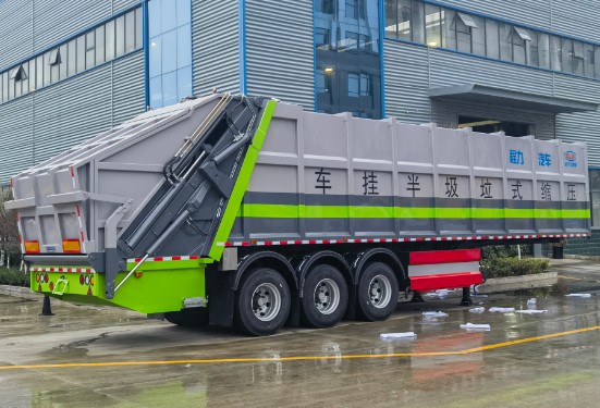 車輛名稱:CL9400ZYSAQC壓縮式垃圾半掛車 容積:47立方整備質量(Kg):19500 總質量(kg):40000 輪胎規格:12R22.5 真空胎 額定載質量:20500 車輛長寬高:13610,13400*2550*3998mm 備注:該車通過垃圾箱,推鏟,填裝機構等裝置,達到垃圾收集裝填及推擠 卸料的作業功能;整車長/軸距/后懸/對應關系為(mm):13610/6090+1310+1310/3290,13400/5880+1310+1310/3290;離地高度為490mm; 箱體:箱體邊板標配為T700高強度耐磨板。箱體邊板 6mm 底板 6 mm,滑道雙層,加厚加強,刮板厚度8mm,填充器底板 10mm,刮板平面厚度8mm. 車軸:標配13 噸富華車橋·鼓剎*3根; 剎車片:標配為 16T。 懸架:標配為180 機械懸掛; 支腿:標配電動支腿; 牽引銷:標配為國產50#或90#牽引銷。 轉彎半徑:8.00 米-10.00 米(僅供參考)。帶科密ABS;車輛外觀含邊燈、輪距、軸距、箱體及掛車外形尺寸等均按公告要求制作。 上裝電液配置: 外接 380V 電源動力驅動,刮板單次循環30秒,刮板滑板油缸加粗,推板主油缸帶平衡支架,所有油缸軸銷經過淬火處理,增加硬度不易彎曲斷裂。安裝兩個大容量污水箱,可作清水箱使用(可選裝20m高壓清洗槍裝置),國內知名品牌大功率電機,配備負載敏感電液比例閥系統,功率損失小,系統發熱量少,延長液壓泵閥缸的使用壽命。先進的可視化電控系 統,搭配高壓過濾器,液壓油散熱器,超大容量液壓油箱,優質液壓油管油缸。全車采用 CAN 智能顯示屏控制系統,遙控控制及同部語音播報。滿載報警提示裝置,系統故障自動檢測功能,采用軟啟動電機熱保護器,配備漏電保護,保證人員安全。箱體容積47方,可裝生活垃圾38噸-40噸。