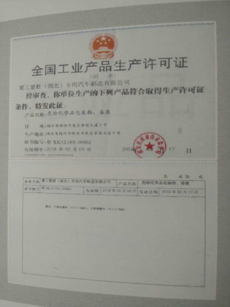 油罐車生產(chǎn)企業(yè)需要那些資質 油罐車是危險品運輸里面最常用的車輛,大到國家項目,小到鄉(xiāng)村,你都能看到它的身影,它與我們的生活息息相關。 今天我們就以全國最大的油罐車生產(chǎn)企業(yè)之一廈工楚勝(湖北)專用汽車制造有限公司為例來說明一下油罐車生產(chǎn)企業(yè)的資質: 廈工楚勝作為全國性的大公司,它所獲得的榮譽是比較多的, 《全國創(chuàng)新型企業(yè)》 《中國馳名商標》 《量管理體系》 《環(huán)境管理體系》等這些是公司基本要求。但作為油罐車生產(chǎn)企業(yè)就必須具有 《全國工業(yè)產(chǎn)品生產(chǎn)許可證(危險化學品)》